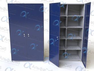 Шкаф ШИМ-05-04 разделен на две секции. В каждой секции расположены пять металлических полок. Шкаф ШИМ-05-04 оборудован двумя дверками с замком и ручкой.