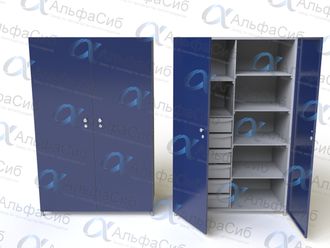 Шкаф ШИМ-15-04 исп.2 представляет собой надежную цельносварную конструкцию, выполненную из профильной трубы и листовых обшивок, полок, выдвижных ящиков. Шкаф разделен на две секции. Внутри левой секции шкафа ШИМ-15-04 исп.2 установлены две металлические полки для инструмента и комплектующих, а также шесть выдвижных ящиков на роликовых направляющих; внутри правой секции – четыре металлические полки. Шкаф ШИМ-15-04 исп.2 оборудован двумя дверками с замком и ручкой.